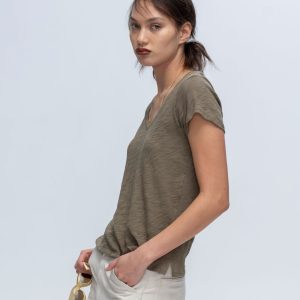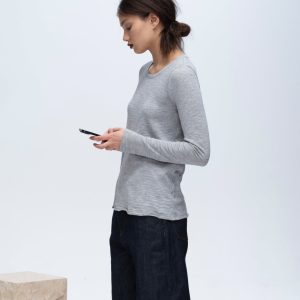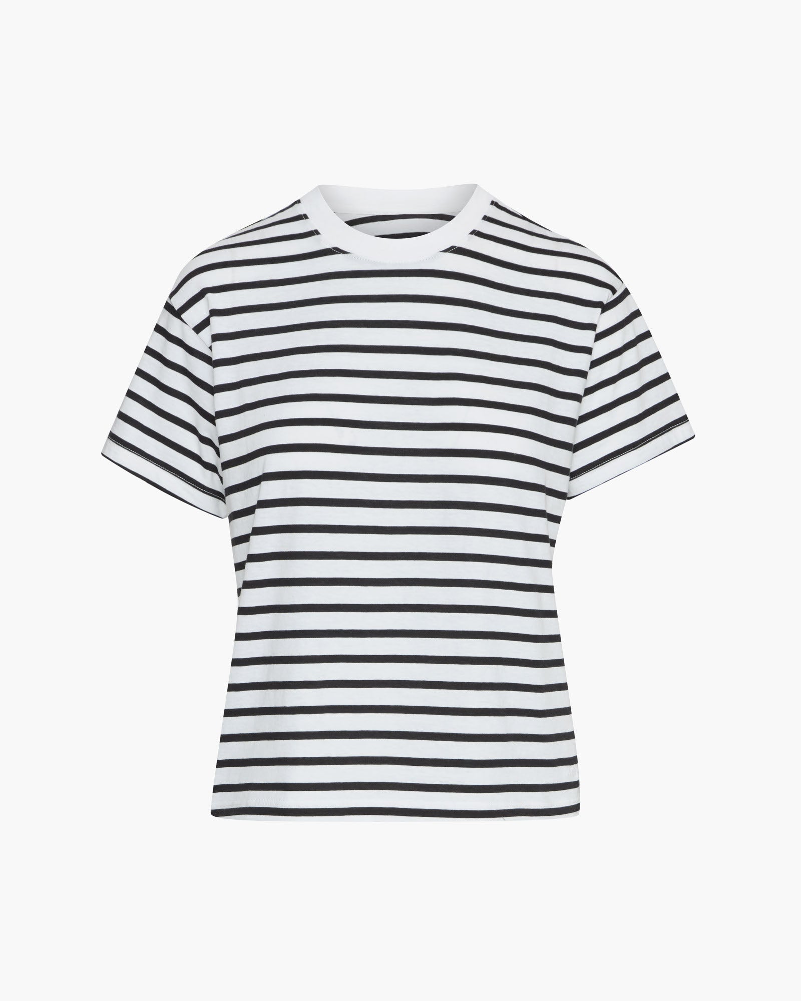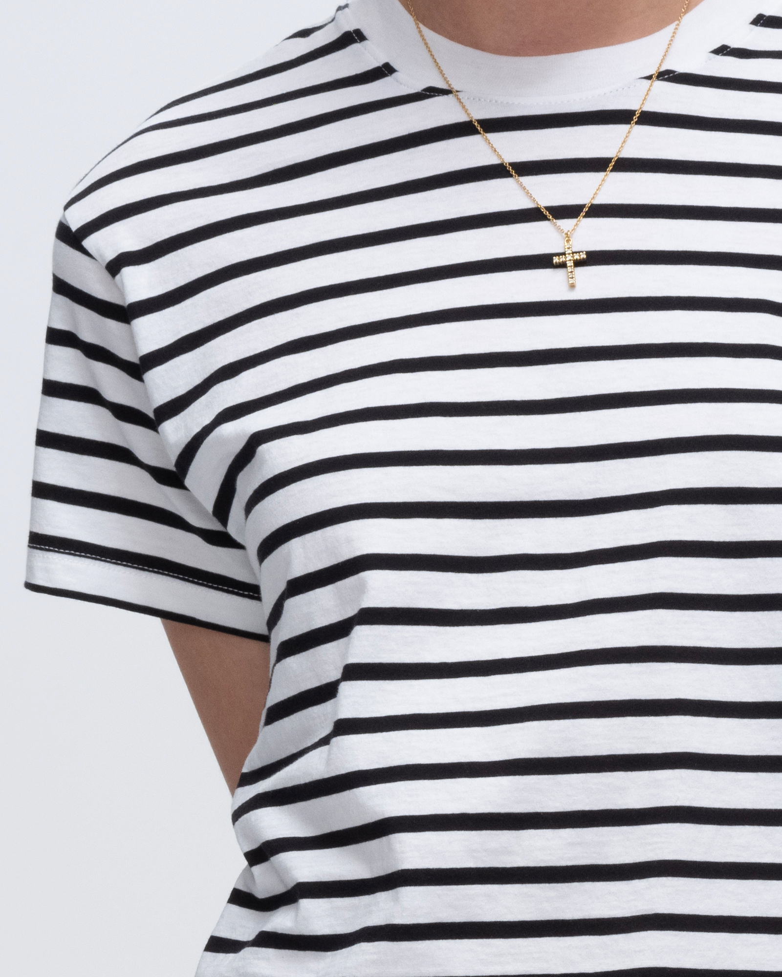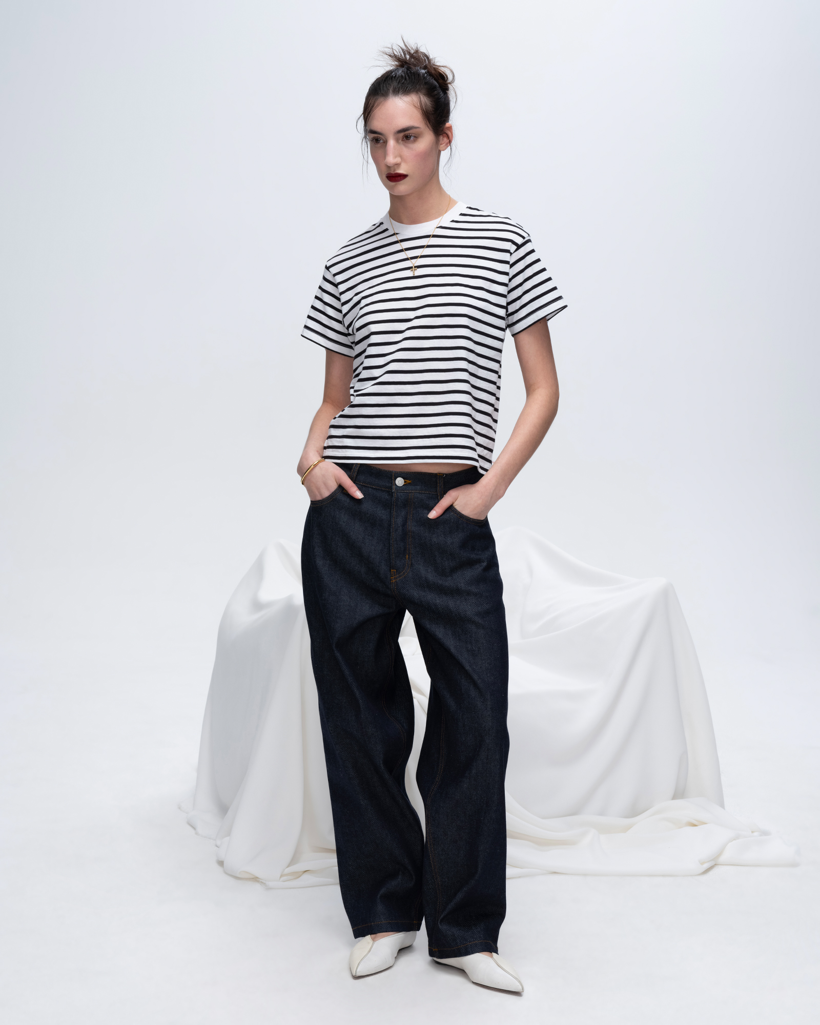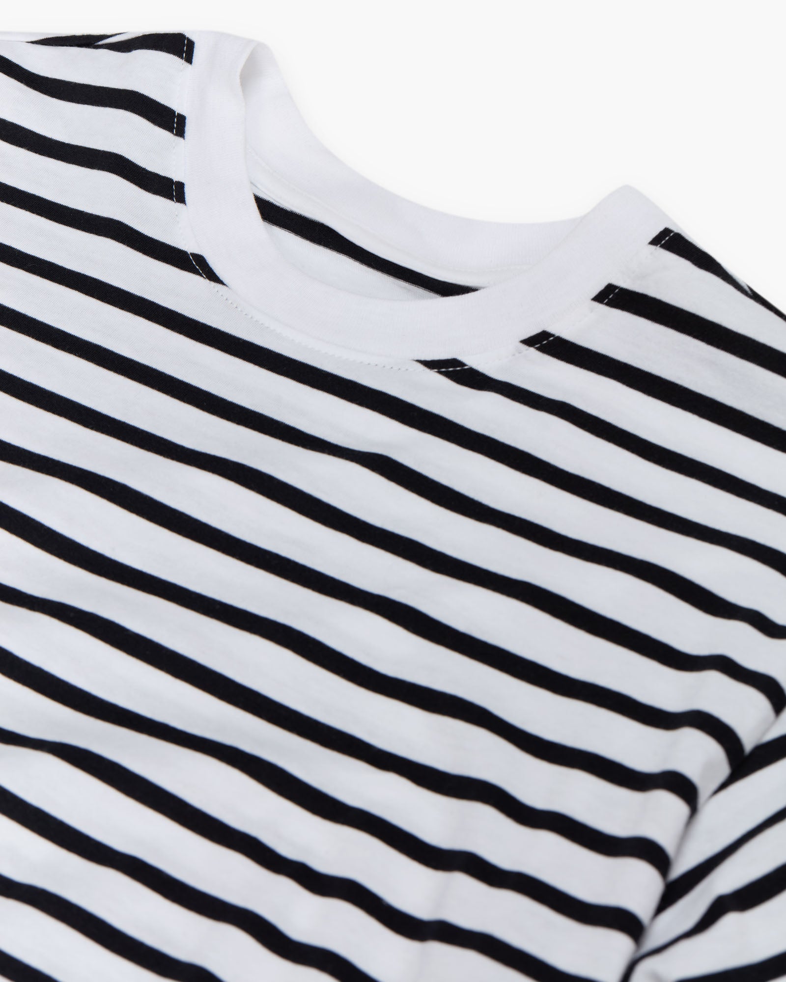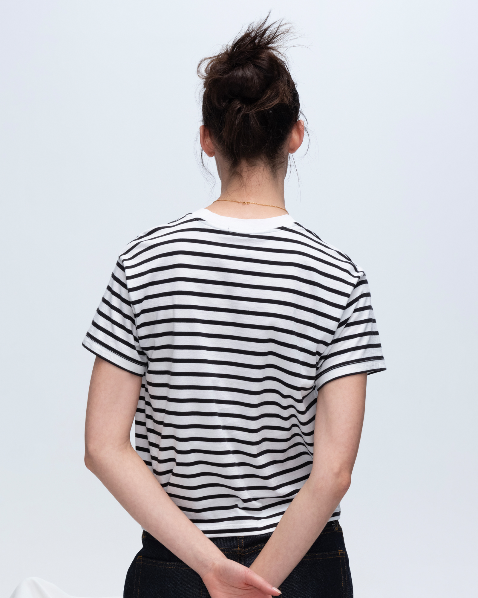 The Classic Jersey Short Sleeve Boy Tee is done in a luxe cotton jersey. It combines the weight and shape of a men’s piece with the fit of a women’s tee. It features a slightly cropped. boxy shape with longer and wider cut sleeves. The classic piece is updated with a black and white stripe print and white contrast collar.