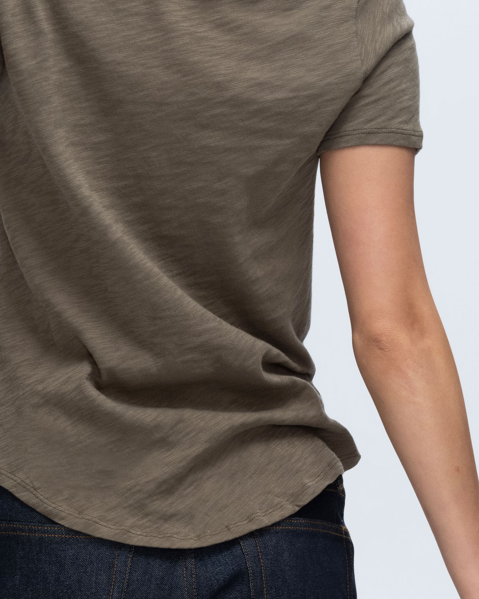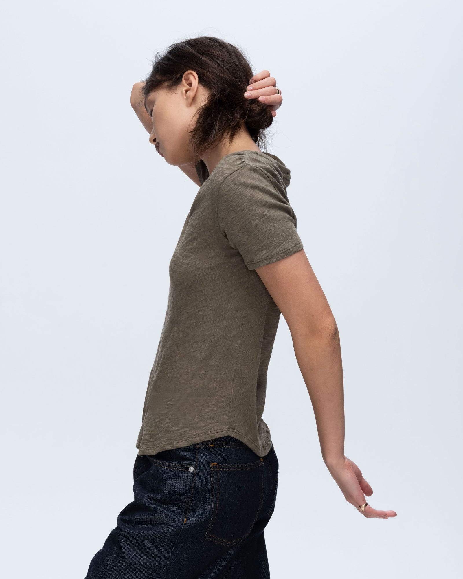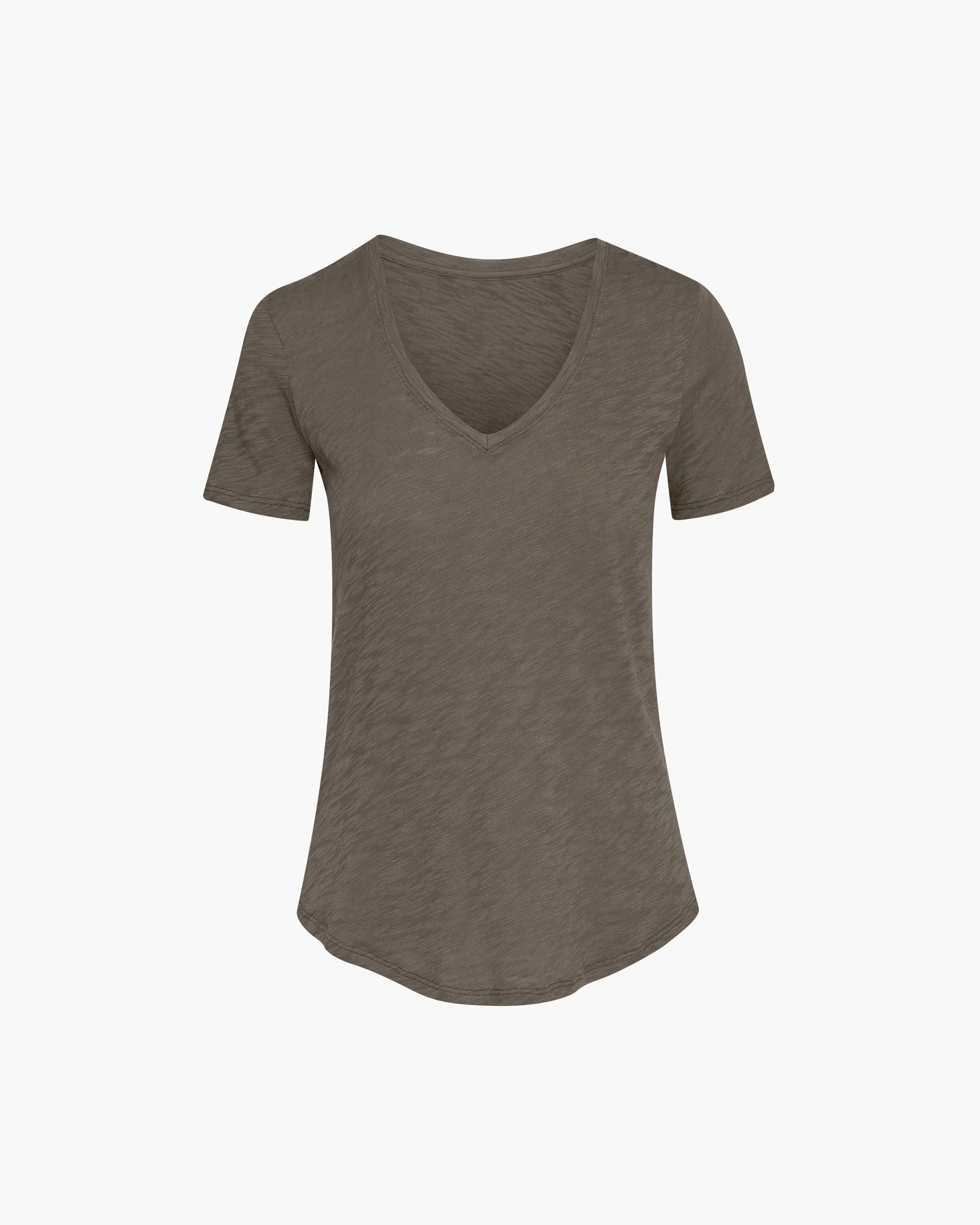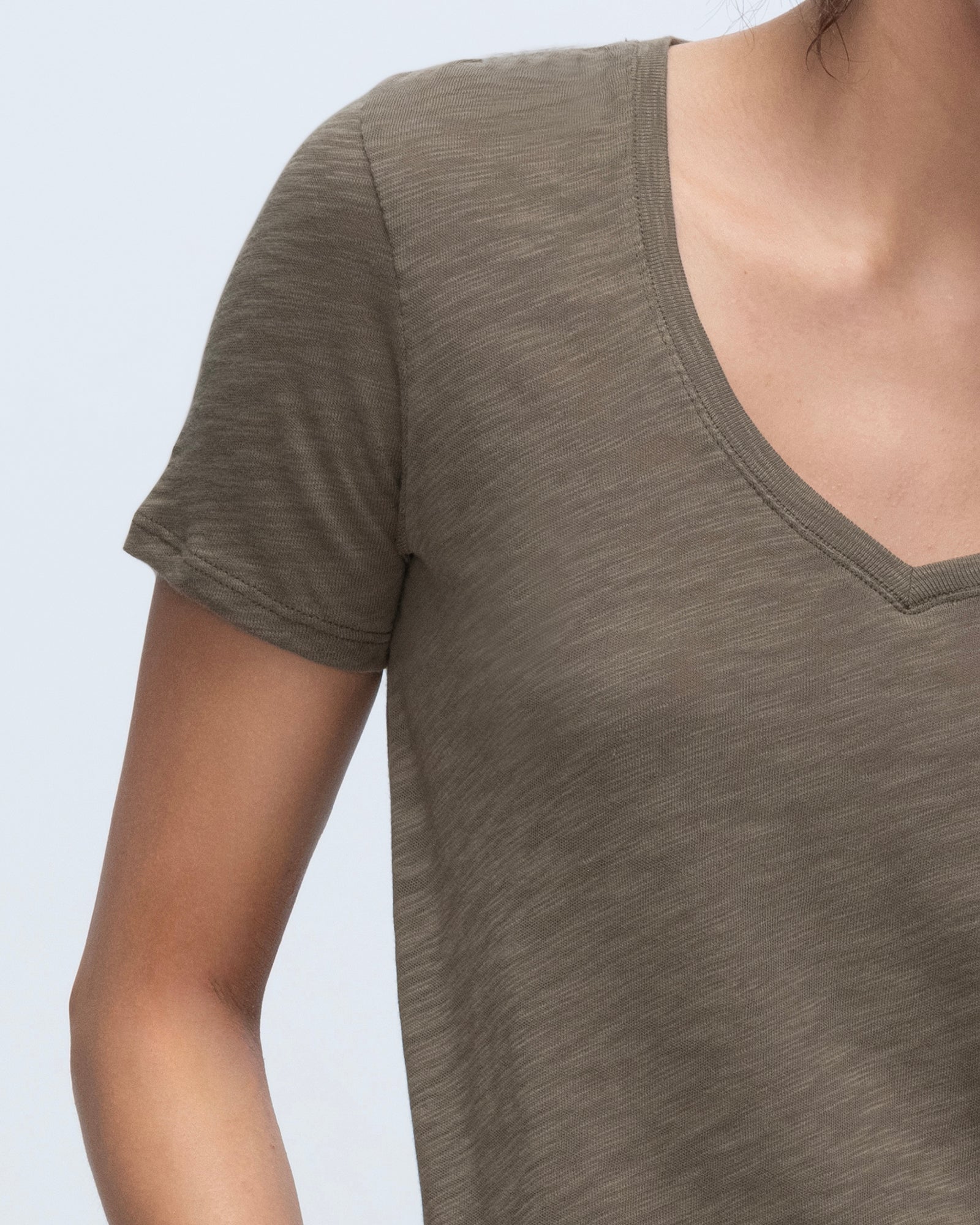 The Slub Jersey Classic V-Neck Tee gets its texture from the uneven yarns of our unique Peruvian Cotton. It features a relaxed v-neck. shirred shoulders and just the right amount of sheer. The loose weave of this heavier Cotton molds modestly to the body offering the perfect drape. Its long. flattering silhouette is meticulously measured–tapered at the bust with a shirttail that covers the butt without cling.