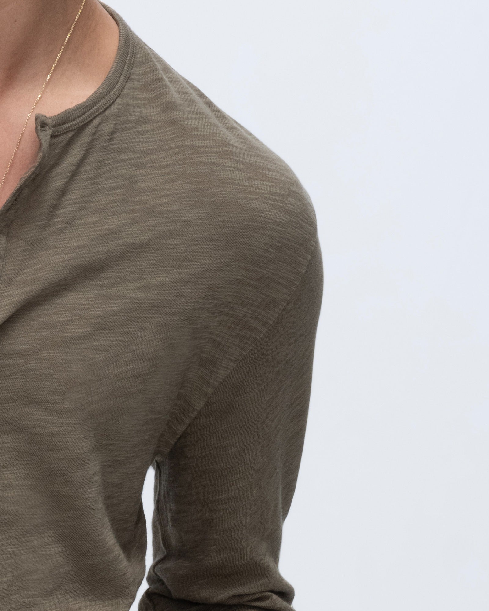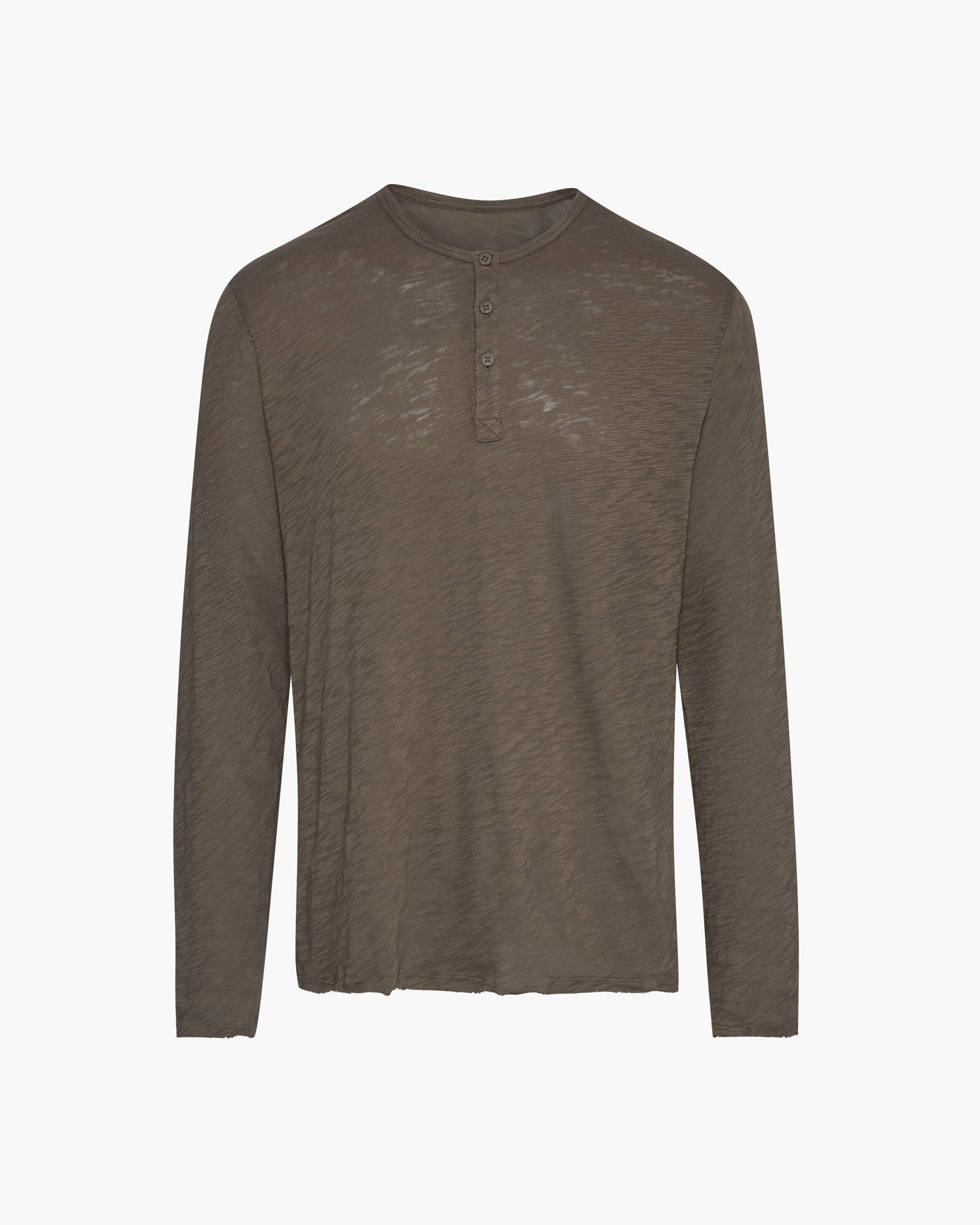 The Slub Jersey Destroyed Wash Henley gets its texture from the uneven yarns of our unique Peruvian Cotton. It features a refined neckline with a narrow placket for a slimming effect. and buttons dyed to match the exceptionally soft Peruvian Cotton composition. The modest drape. straight cut hem and meticulously measured neckline offer an elevated take on the classic silhouette.